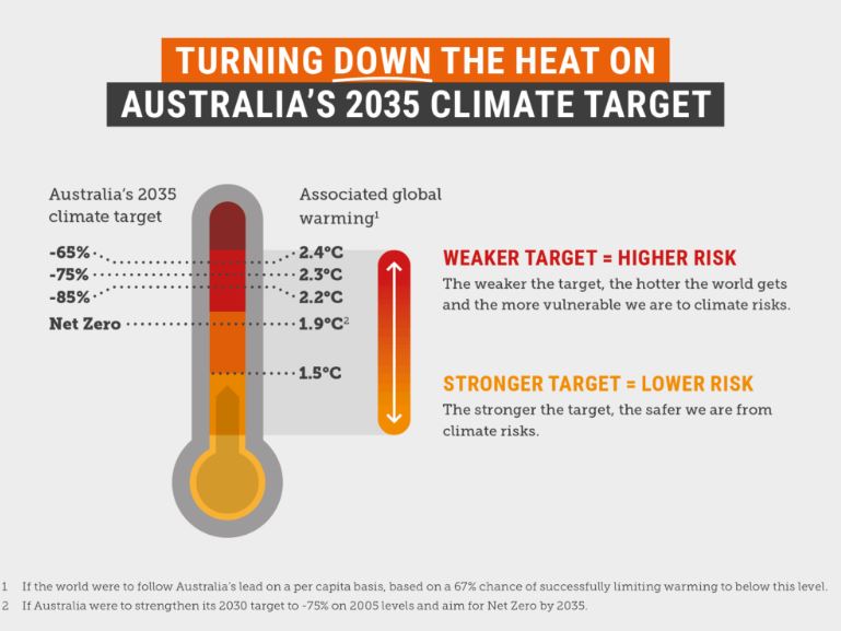 Mức giảm nhiệt cho mục tiêu khí hậu năm 2035 của ÚcTuy nhiên mục tiêu này vẫn chưa làm hài lòng tất cả. Các tổ chức môi trường và nhiều nhà khoa học cho rằng mức giảm 62-70% chỉ là “tối thiểu” và Úc cần đặt mục tiêu ít nhất 75% để phù hợp với kịch bản giữ nhiệt độ toàn cầu không tăng quá 1,5 độ C. Một số ý kiến khác lo ngại rằng Úc khó hoàn thành mục tiêu 2030 nếu thiếu hành động quyết liệt, và điều này sẽ kéo theo rủi ro cho cả cam kết 2035.
