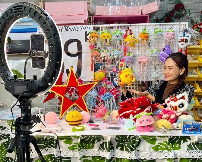 Chị Trang ứng dụng công nghệ số để lan tỏa sản phẩm và thông điệp bảo vệ môi trường (Ảnh: doanhnghiepvn)Không dừng lại ở Trung Thu, chị Trang còn ấp ủ mở rộng sáng kiến sang các dịp lễ khác như làm đèn ngủ, chuông gió, đồ trang trí Noel, Tết từ vật liệu tái chế.