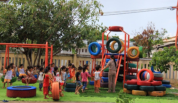 Khu vui chơi trẻ em được làm từ lốp xe tái chế (Ảnh: thanhnien)Một số doanh nghiệp lớn đã có những bước đi đáng ghi nhận. Michelin hiện đã sử dụng 30% nguyên liệu tái chế và sinh học trong lốp thương mại, đặt mục tiêu đạt 100% vào năm 2050. Bridgestone Việt Nam đến cuối năm 2024 đã thu gom được hơn 1.000 tấn lốp, vượt mục tiêu đề ra, đồng thời triển khai tái chế thành dầu và phát triển dòng lốp giảm lực cản lăn giúp tiết kiệm nhiên liệu và giảm phát thải CO2. Nhà máy Sagama tại Vĩnh Phúc từ năm 2019 cũng tiên phong trong việc biến lốp phế thải thành sản phẩm dân dụng và công nghiệp.